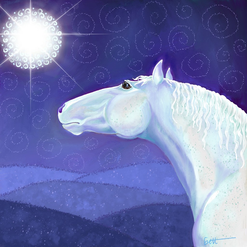 Freezing rain and sleet tinkled against the day’s accumulation of ice. It was the winter solstice, the longest night of the year. The ground was roughly rutted, a little frozen on top but with deep sucking mud underneath, and the footing was tricky. I wanted to look up to see the Bethlehem Star – the great conjunction of Jupiter and Saturn. I wanted to get Spider into his stall where soft shavings, a fresh bucket of water, and a meal awaited him. But I also really wanted to see those converged planets, forming the appearance of one large star, the Christmas Star. Perhaps it would make Christmas seem more real in a year when loved ones are hurting, are far away, are ill, and we are all separated for safety.